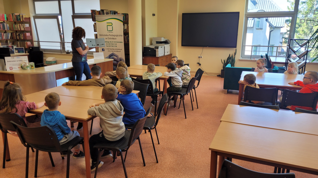 Podczas zajęć z uczniami szkół średnich wykorzystywaliśmy interaktywny monitor dotykowy, którego zakup został sfinansowany ze środków Samorządu Województwa Mazowieckiego w ramach realizacji projektu Budżetu Obywatelskiego Mazowsza „Dobrostan w bibliotece”.