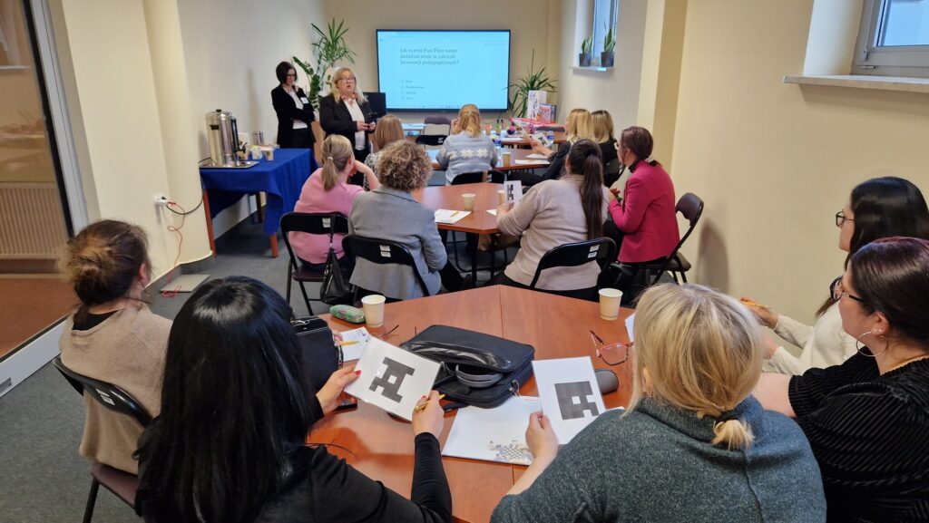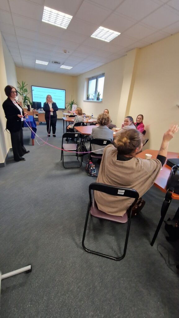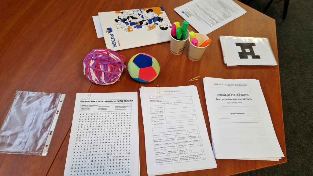 25 lutego 2026 r. doradczynie metodyczne MSCDN, Alicja Lewandowska i Elżbieta Rogalska, wykorzystując kłębek wełny i darmową aplikacją edukacyjną PLICKERS do szybkiego przeprowadzania quizów, ankiet i sprawdzianów wiedzy w klasie w czasie rzeczywistym, wdrażały uczestników szkolenia w arkana INNOWACJI PEDAGOGICZNYCH W BIBLIOTECE SZKOLNEJ. Po części teoretycznej przyszedł czas na tworzenie nowatorskich rozwiązań programowych, organizacyjnych lub metodycznych dostosowanych do potrzeb danej szkoły lub placówki.